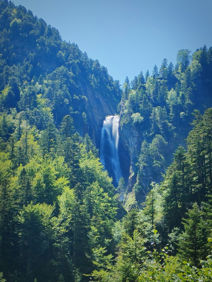 Caminaremos por bosque y, sobre la cota 1500, debemos girar la cabeza a la derecha para ver entre los árboles la impresionante cascada de Le Pich d’Ouscouaou, un salto de agua de decenas de metros que conforma el arroyo de Lesponne.