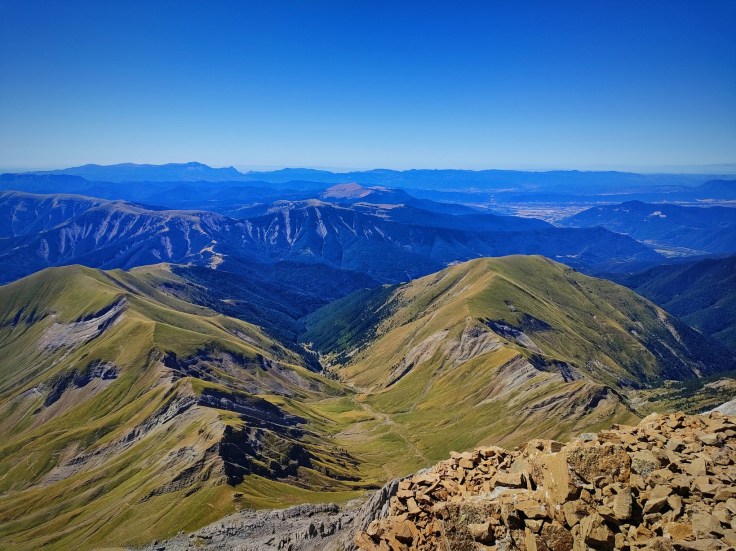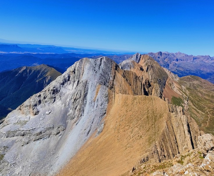 Y vamos con las vistas. Lo primero que llama la atención es el cresterío de la propia Sierra de Tendeñera que se extiende hacia el Oeste con sus cambios de color, de marrón a gris. Impresionante.