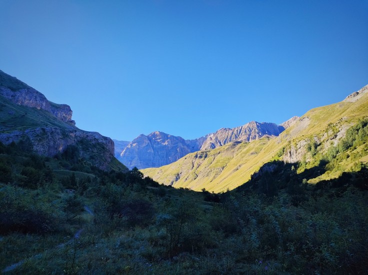 Este valle está recorrido por un viejo sendero que debió ser el GR-11 pero que ya está descatalogado por ello está un poco dejado, con la hierba un poco alta… pero se sigue bien. Veremos viejas marcas blancas y rojas en las rocas que nos pueden servir de referencia.