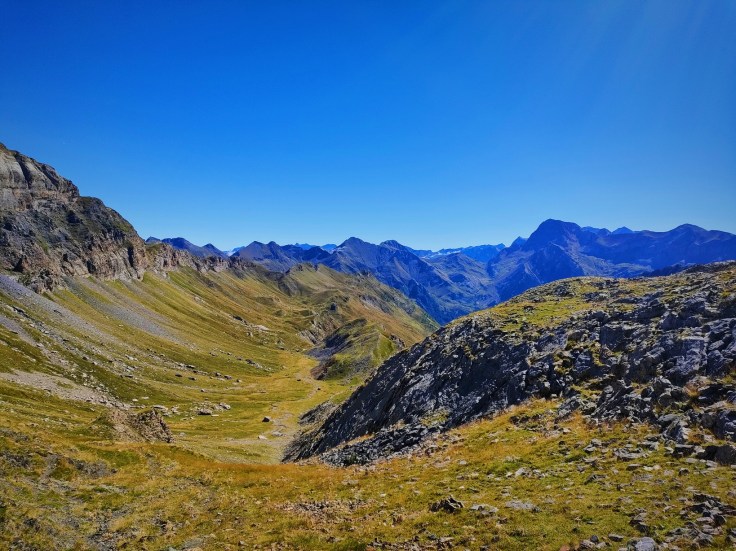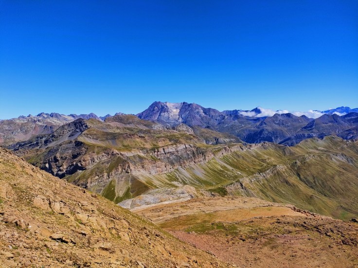 Sin prisa pero sin pausa alcanzaremos el Collado de Tendeñera (2.351 m). Las vistas se abren hacia el Sobrarbe, destacando Ordesa y el macizo de Vignemale. Brutal.
