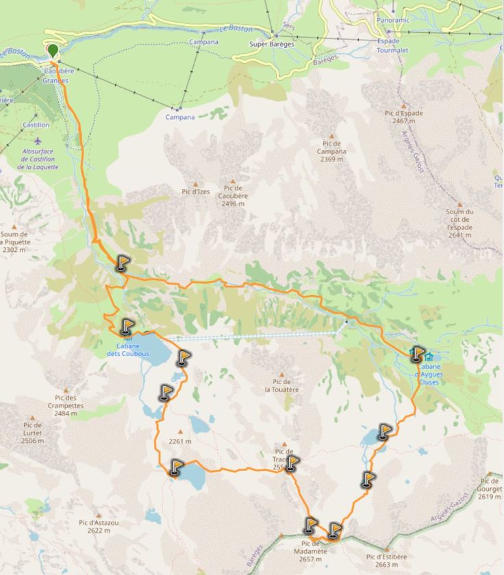La ruta comienza en el amplio aparcamiento de Tournaboup, a 1.460 metros, perteneciente a las instalaciones de la estación de ski de Grand Tourmalet. Ascenderemos por el valle de Coubous para acceder a su cuenca lacustre, donde visitaremos cuatro de estos ibones para terminar coronando el Col de Madaméte (2.508 m). Desde el collado, subiremos a la cima del pico del mismo nombre y bajaremos por la misma vía para después seguir bajando por los Lacs de Madaméte y el refugio de Aygues Cluses (en construcción). Una ruta circular muy completa y sin apenas dificultades técnicas que nos permite descubrir esta zona tan bonita del Pirineo central francés.