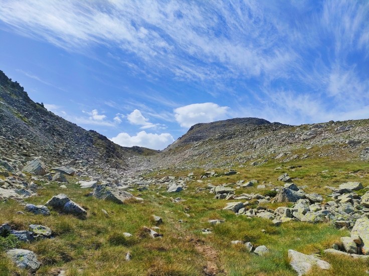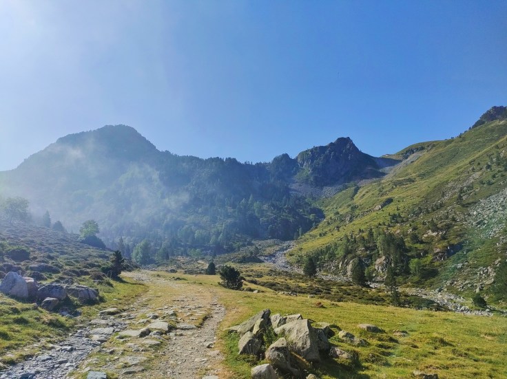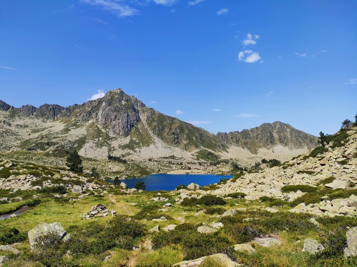 Seguiremos las marcas del GR-10 para la bajada. Hay tramo cómodos que se alternan con otros más pesados, de mucha roca. En general, se baja bastante bien.