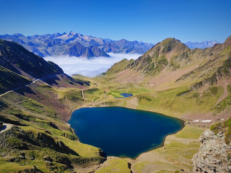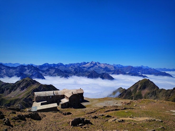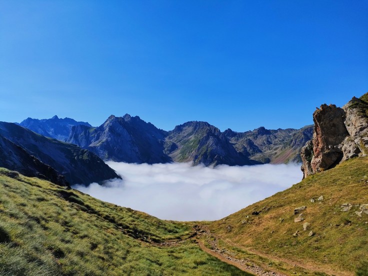 Las vistas son fantásticas a pesar de que el mar de nubes cubre toda la llanura francesa y por debajo de los 2.000 metros permanece cubierto. Al Sur, destaca el macizo de Néouvielle que hemos recorrido estos días.