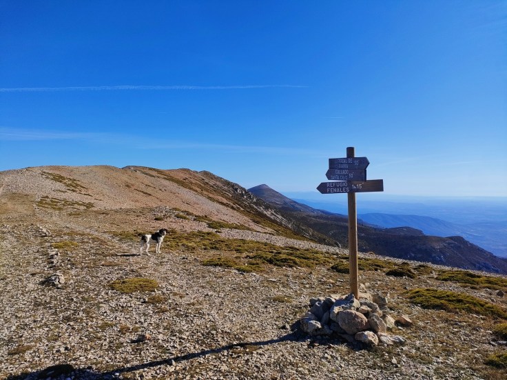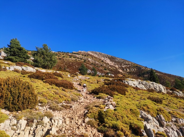 Saldremos del pinar y afrontaremos el tramo final. El camino está muy marcado y es bien visible. Avanzaremos entre erizones y bojes por un paisaje duro, sin una sombra. Veremos un desvío a mano derecha hacia las pedreras (Canal de Abadejo), pero no lo tomaremos, ese camino solamente es recomendable hacerlo de bajada si volvemos por la cara Sur.