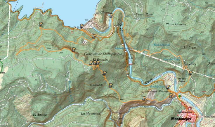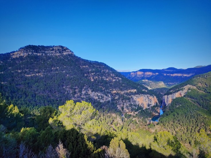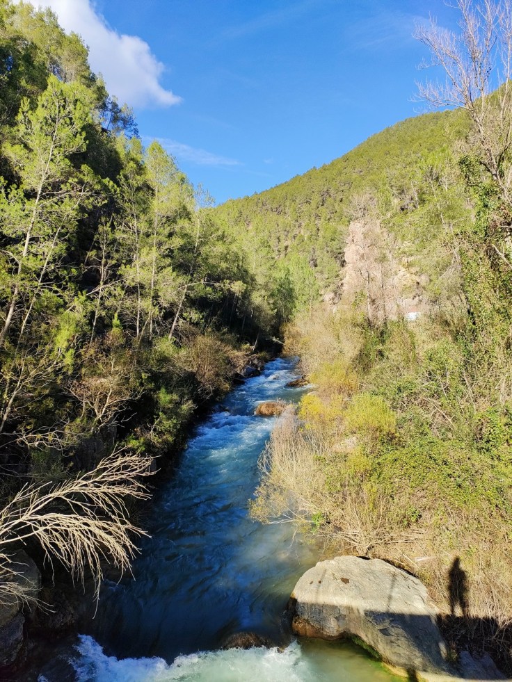 Tras pasar por El Chorro, el camino se introduce ahora en los Estrechos del Mijares, un tramo muy bonito de senda que discurre paralela al río. Cruzaremos una pasarela y nos elevaremos al otro lado del río pasando por encima del pequeño embalse de Cirat.