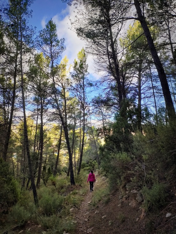 Tras caminar unos kilómetros en leve descenso con dirección Oeste, giraremos 180 grados y conectaremos con otro camino más amplio, conocido como senda de Los Calpes por ser un camino de herradura que comunica Montanejos con este otro pueblo. El camino es muy agradable, con amplios tramos de cómodo llaneo atravesando un pinar.