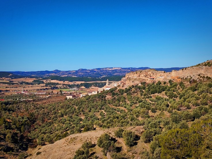 Dejaremos el coche junto al centro Inhospitak de Dinópolis, en la parte baja del pueblo, así evitaremos callejear. Una vez en marcha, saldremos del casco urbano y tomaremos el sendero balizado con marcas blancas y amarillas (PR-TE 157).