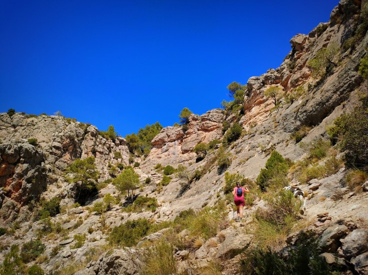 Tras más de una hora caminando bajo un sol de justicia, comenzaremos a bajar hacia el barranco de Huesca por un camino precioso que traza un marcado zig-zag. Perderemos metros de forma rápida hasta alcanzar el lecho del barranco.