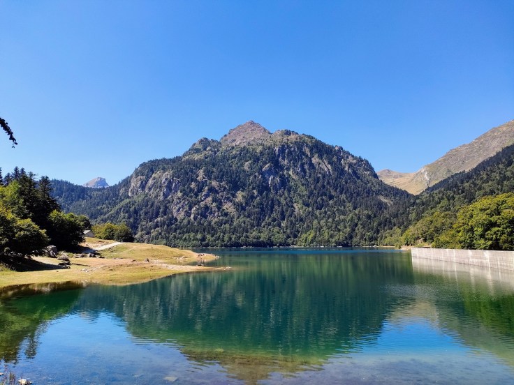 Tomamos el abarrotado sendero que conduce al lago de Bious Artigues. Asciende por una ladera de hierba hasta dar con la represa de este gran lago.