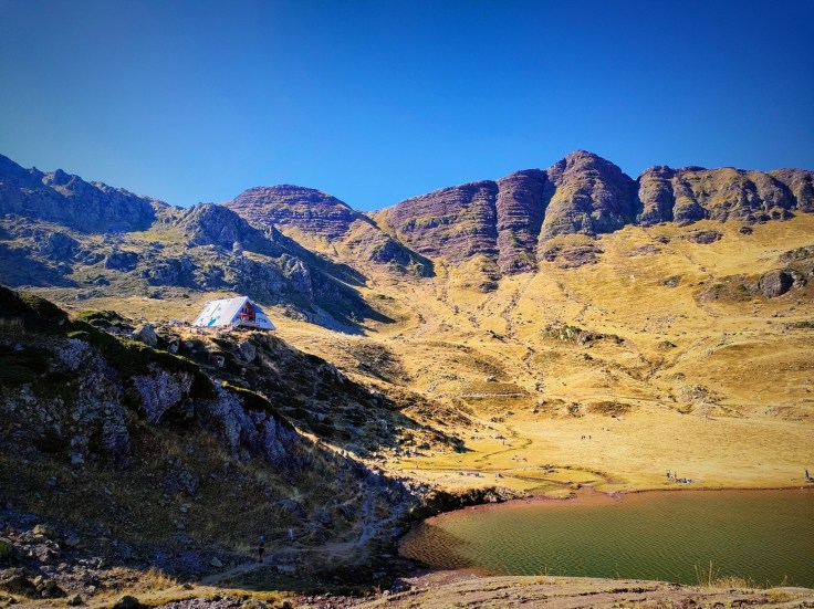 Tras la parada, acometemos la sencilla ascensión al Pic d’Ayous que se encuentra encima justo del refugio. Destaca por sus paredes de color rojizo intenso que caen a pico sobre el lago Gentau.