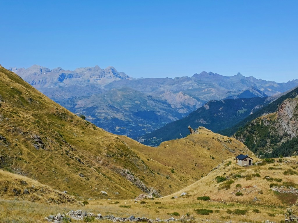 Al llegar al collado las vistas se abren hacia el valle contiguo de Piniecho y hacia los grandes picos de Panticosa, los tresmiles situados encima del balneario… Garmo Negro, Argualas. La panorámica es muy buena.