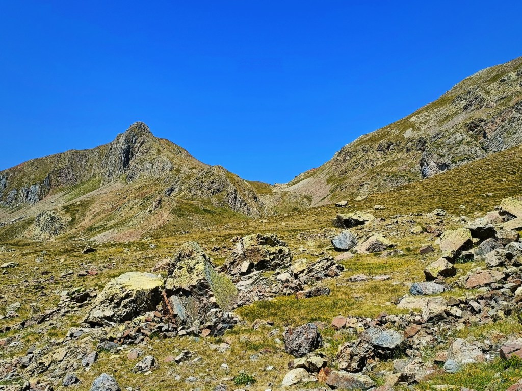 Tras estar un ratito en la cima echando fotos tocará bajar por el larguísimo camino de vuelta. Muy importante, portar agua… Gasté tres litros y eso que el día no era muy caluroso. El perro bebió de los arroyos y del lago. No recomiendo coger agua de arroyos ya que el valle de Laulot y la zona de Catieras tiene rebaños de ovejas que suben muy alto. Si cogemos agua mejor potabilizarla con pastilla.