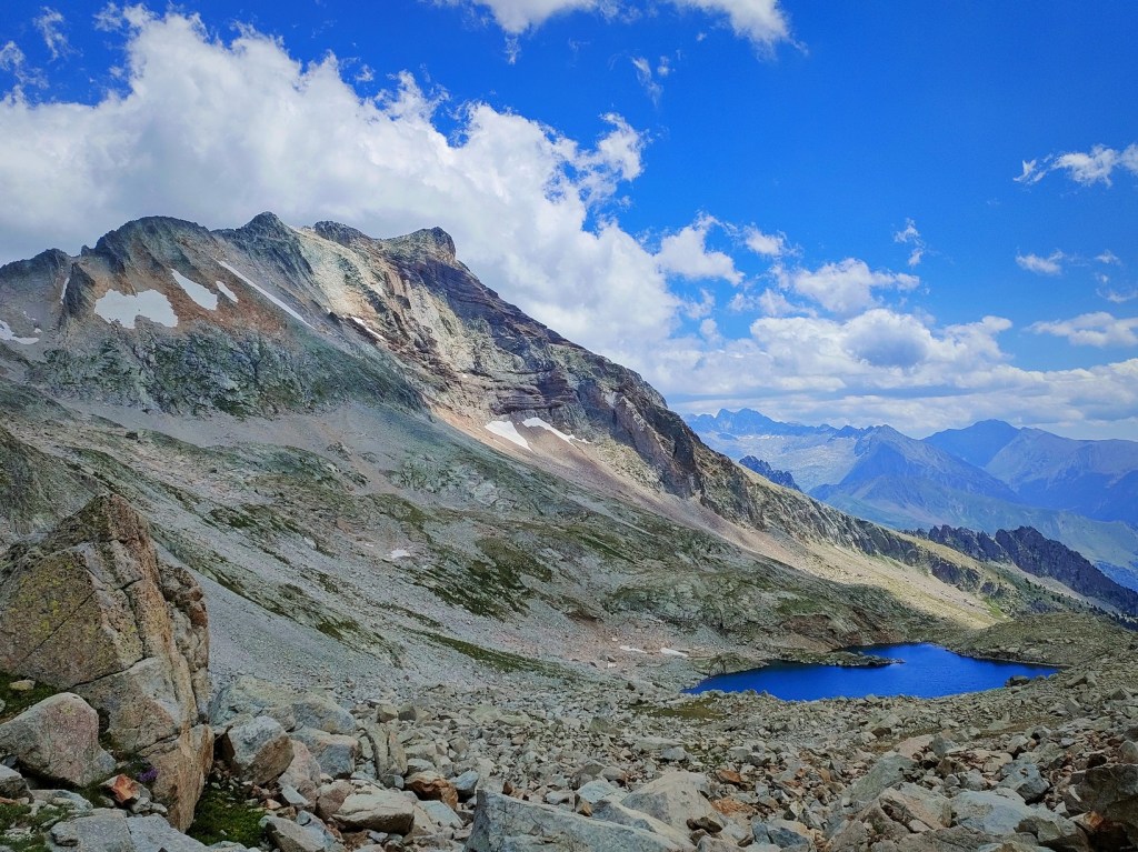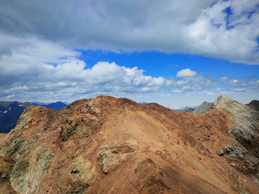 Bajaremos del Gias y comenzaremos un descenso por la ladera Este. La bajada, por pedrera, está marcada, tiene senda y algunos hitos aunque es más rota e incómoda que el camino de subida. A cambio, nos ahorraremos volver hasta el Clarabide Oriental. Creo que merece la pena…