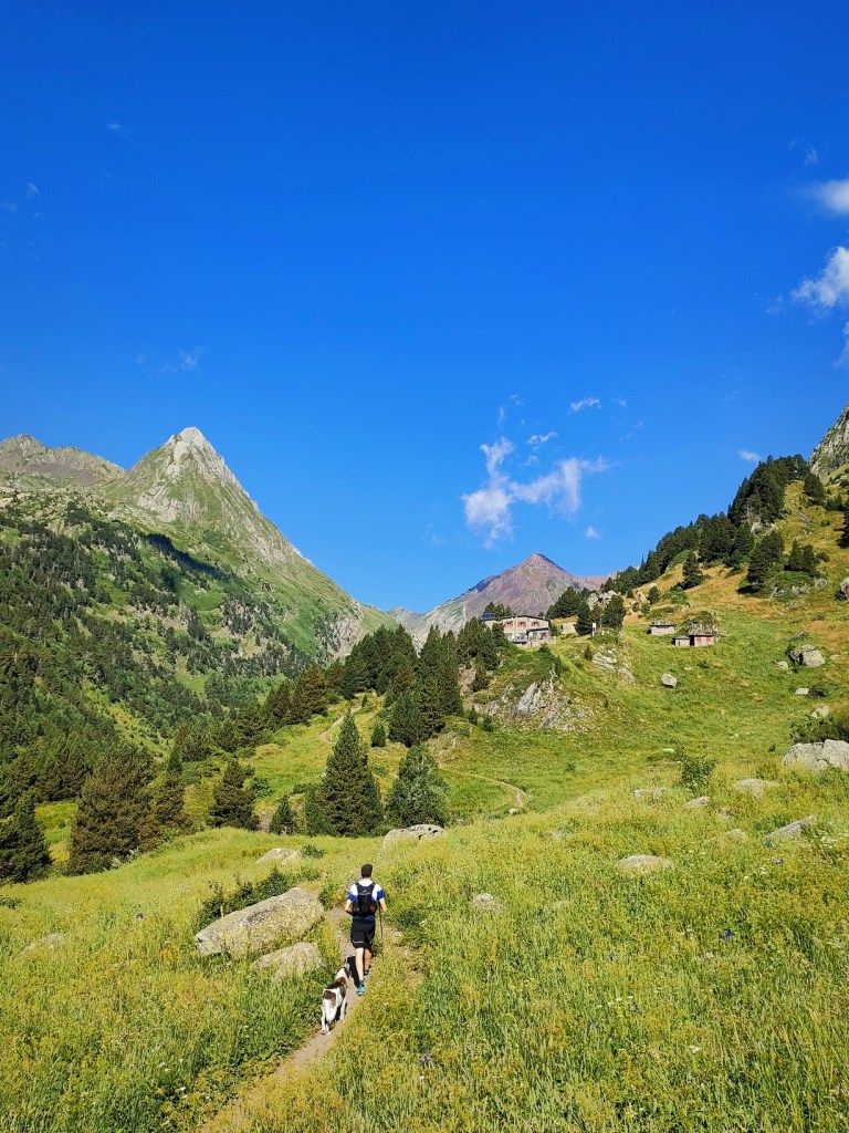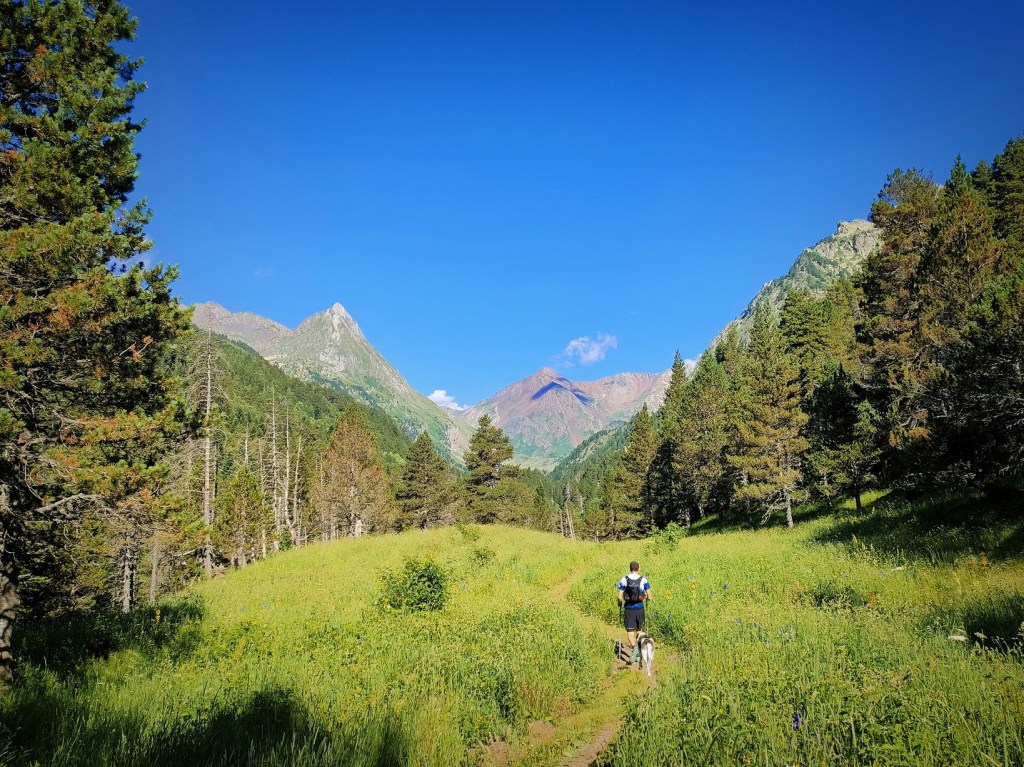 El camino al refugio de Estós es largo, son 8,5 km, pero es cómodo. A los 5 km. del aparcamiento pasaremos por la famosa Cabaña del Turmo y el camino de tierra pasará a ser una senda muy agradable.