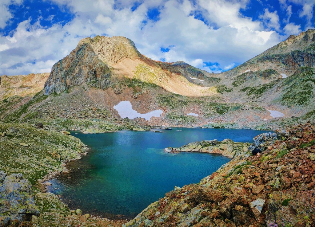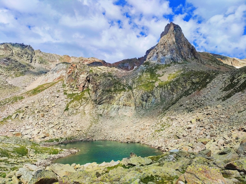 El camino está bastante bien marcado con hitos, se nota que es una ruta popular en verano. Pasa junto al ibón inferior de Gias y luego alcanza el ibón superior, muy bonito y fotogénico. Subiremos a una pequeña colina junto al lago para hacer buenas fotos de este bonito paraje de alta montaña.