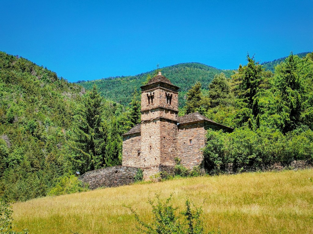 Alternaremos tramos de frondoso bosque con otros de terreno más despejado, siempre por senderos bastante cómodos y agradables. Bajaremos sin descanso hasta dar con una pista asfaltada que conduce a la ermita de San Bartolomé de Gavín, una de las joyas del románico de las iglesias del Serrablo. Nos acercaremos a ella para fotografiarla y volveremos para tomar el sendero que nos devuelve a Gavín.