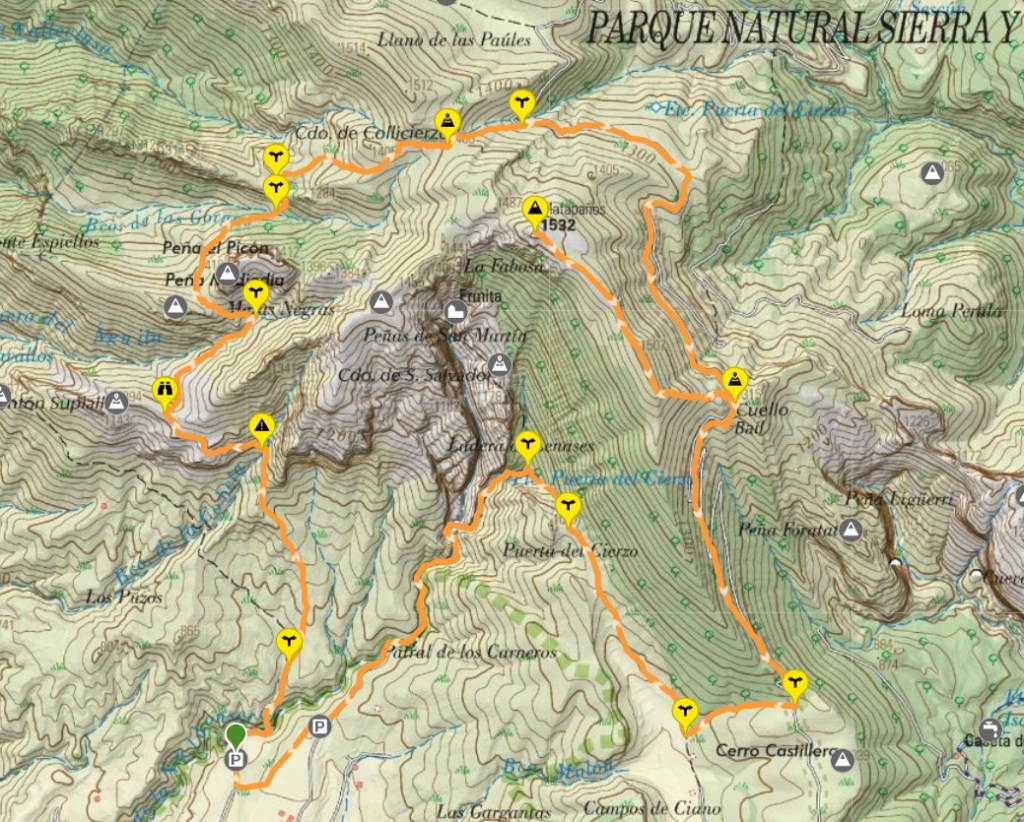 Comenzaremos la ruta por el sendero y, en primer lugar, cruzaremos el barranco de San Martín. Tras ello, comenzaremos a ascender por un buen sendero, muy marcado. Nos toparemos pronto con un cruce de caminos: a la izquierda la Peña Amán, a la derecha el Picón del Mediodía, tomaremos el camino de la derecha y ascenderemos de manera cómoda acercándonos a las escarpadas paredes de la Peña Leneses (1.431 m).