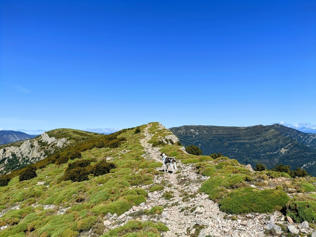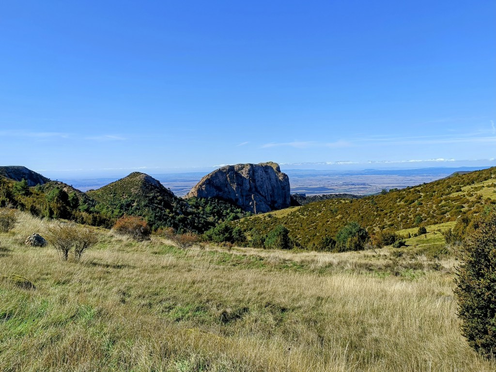 Tras un par de kilómetros, la pista nos dejará en un nuevo collado: el Cuello Baíl (1.315 m). Es un importante cruce de caminos. Desde aquí sale el sendero que nos llevará a la cima del pico Matapaños. El primer tramo de este sendero es una dura subida pedregosa y después recorreremos el lomo de la montaña, cómodo, suave y con muy buenas vistas.