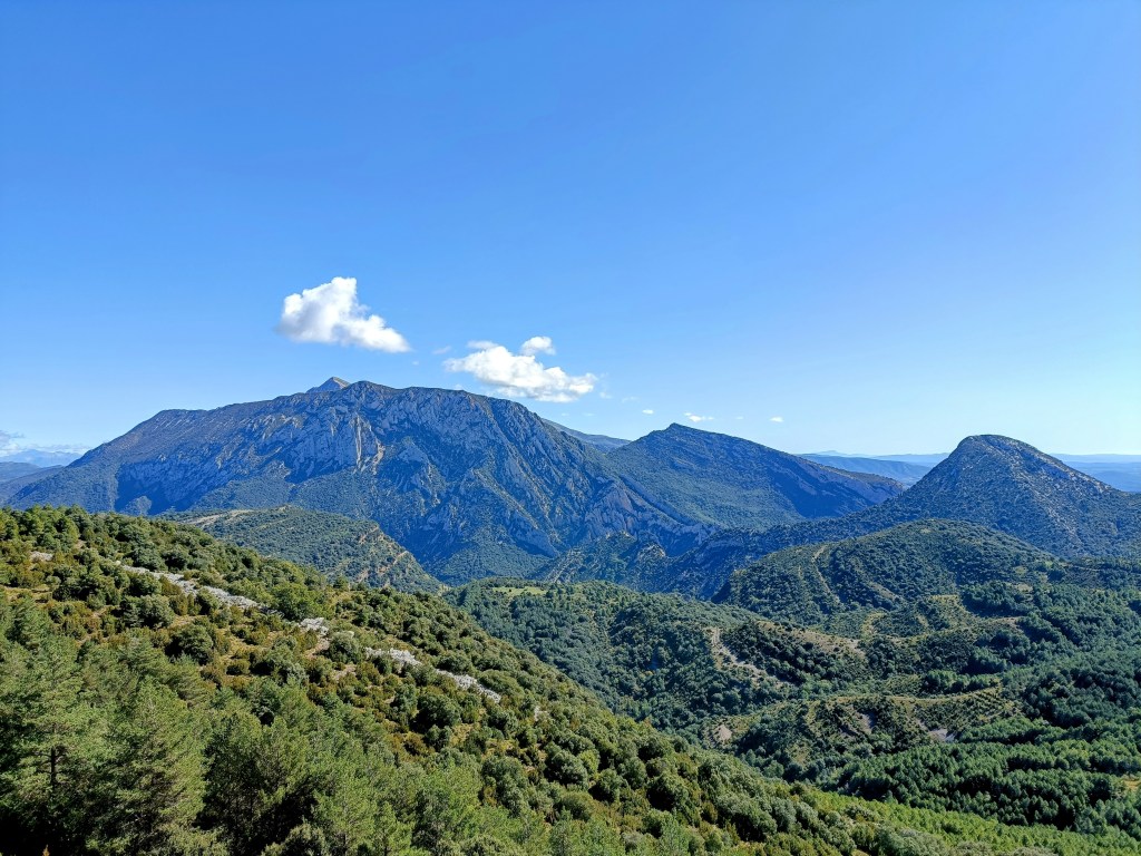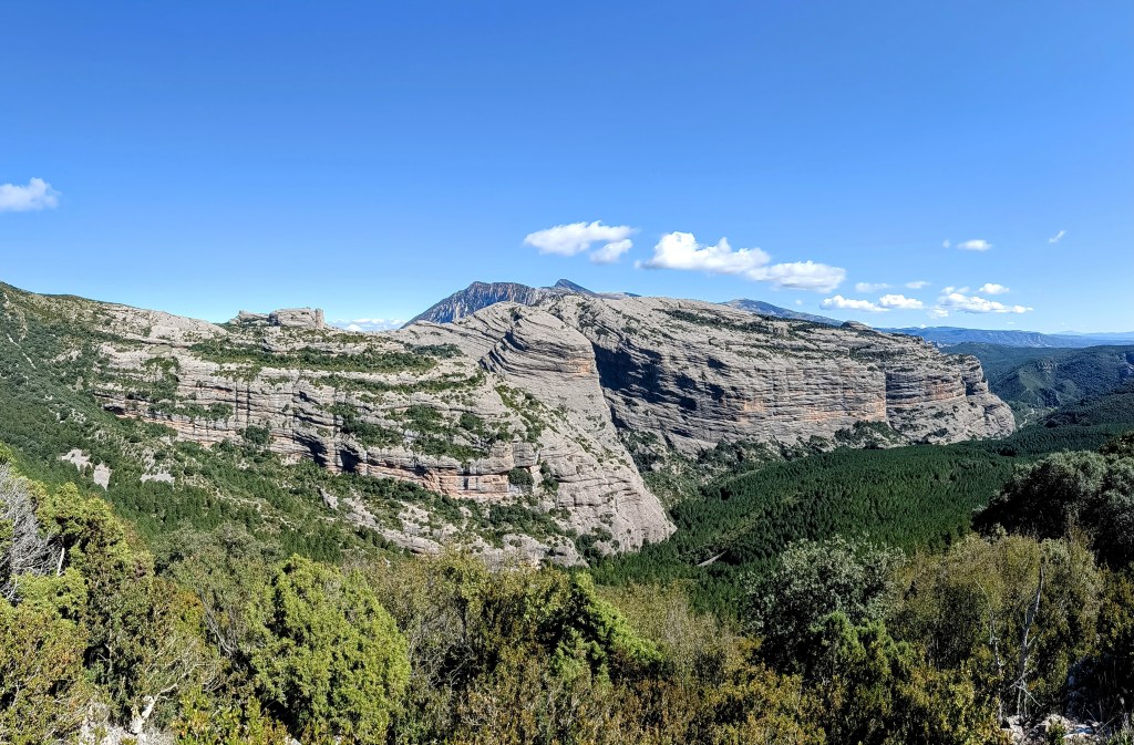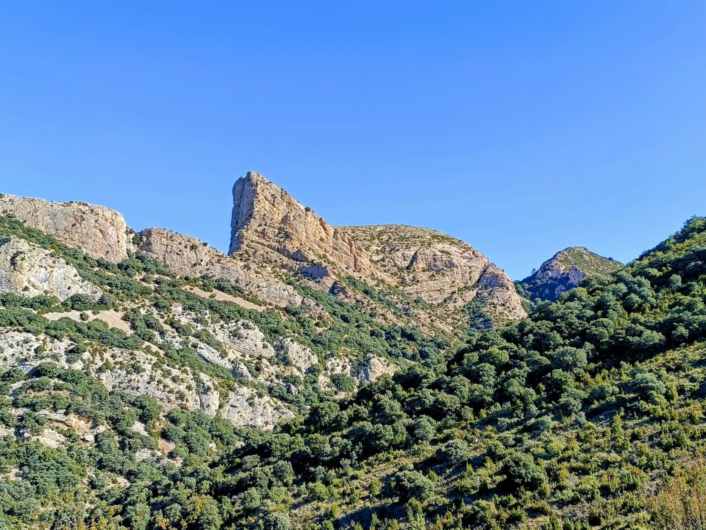 Comenzaremos a descender por sendero con unas vistas impresionantes del Tozal de Guara (2.077 m) y del pico Fragineto (1.749 m). Pronto conectaremos con una pista forestal que va rodeando la cara Norte del Matapaños por un bonito bosque.