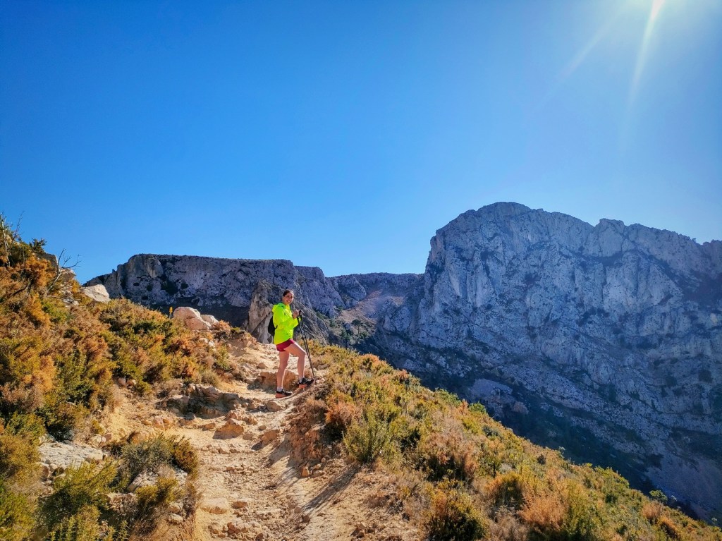 La senda es muy solana (ojo los días de calor) pero también muy bonita. Tendremos en todo momento a nuestra derecha las enormes paredes de la sierra y a mano izquierda toda la panorámica del mar Mediterráneo y el Puig Campana.