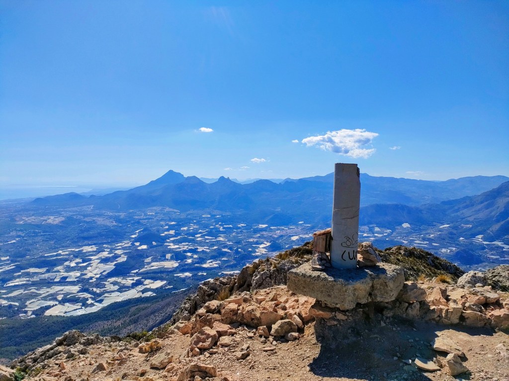 Las vistas desde este lugar son muy buenas hacia el Sur. Un mar de picos se extiende por toda la comarca de la Marina Baja: Puig Campana (1.408 m), Ponoig (1.182 m), Cabal (1.188 m)