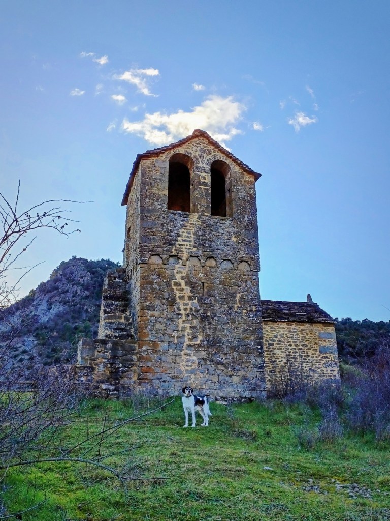 Este sendero es una maravilla: bien marcado y con muy buenas vistas. Iremos volviendo a Belsué pero por el camino encontraremos varios puntos muy interesantes y que cabe destacar: el primero es el pueblo abandonado de Santa María de Belsué, con su vieja iglesia que mantiene su torre intacta aunque su techumbre está derruida.