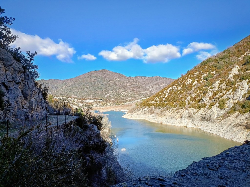 Ya por la senda avanzaremos hacia la presa con el embalse a mano izquierda. Seguramente os llame la atención lo vacío que está el embalse, especialmente si lo comparamos con otros de la zona como el de Arguis o el de Montearagón. Este pantano de Belsué se construyó a comienzos de los años 30 del siglo XX y siempre ha tenido graves problemas de filtraciones debido al terreno kárstico de la zona. Esto ha hecho que nunca haya llegado a utilizarse para el riego, fin con el que fue construido.