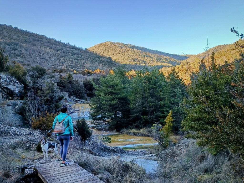 Más adelante, cruzaremos el río Flumen por una buena pasarela de madera y ganaremos altura pudiendo divisar las famosas Gradas del Flumen o pozas de Belsué, muy concurridas en verano por bañistas.