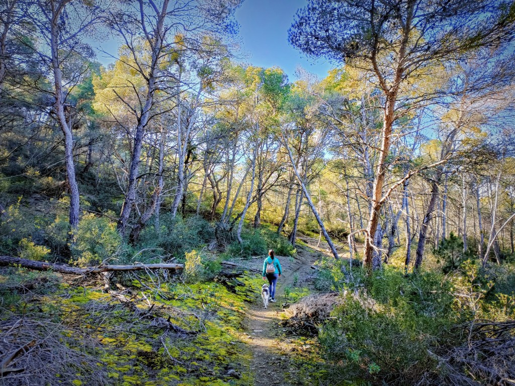 La pista recorre el lomo de la sierra y tiene unas vistas muy bonitas, más si tenemos en cuenta que caminamos por ella al atardecer con un bonito sol de invierno. A nuestra espalda quedará la cima de San Caprasio muy reconocible por la ermita que hay en su cumbre y por ser la máxima altitud de estas sierras con 834 metros.