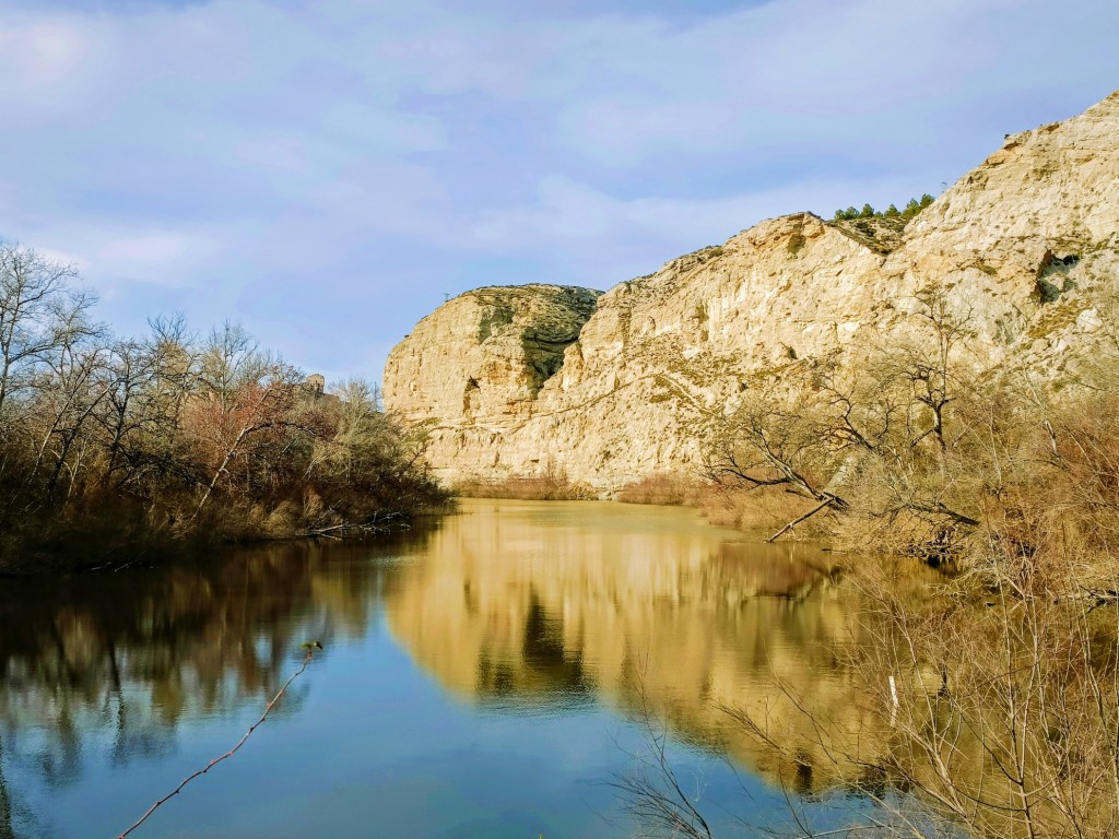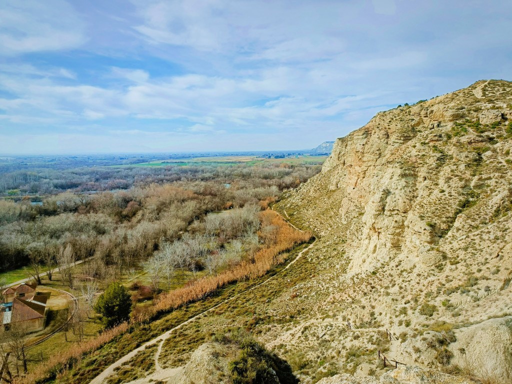 Volvemos a la ruta… Ahora toca caminar por encima del escarpe. El terreno es árido, pura estepa, pero las vistas son muy buenas. Pasaremos junto a un bonito mirador para después descender a la entrada del galacho por un sendero que traza un zig-zag para perder altura de forma cómoda.