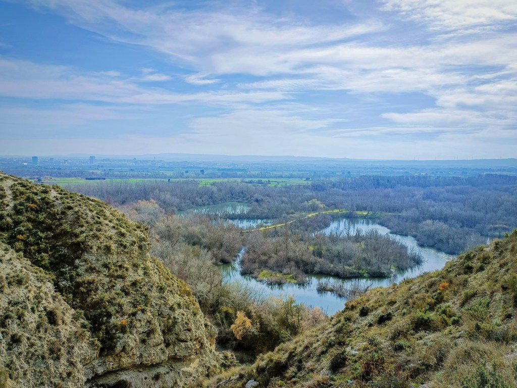 En este punto tomaremos un sendero que va girando poco a poco a la derecha y toma altura hasta alcanzar una meseta con muy buenas vistas del Galacho de Juslibol y de la ciudad de Zaragoza. Giraremos nuevamente a la derecha para asomarnos a un mirador natural desde donde se obtiene una vista excepcional del Castillo de Miranda, al otro lado del barranco.