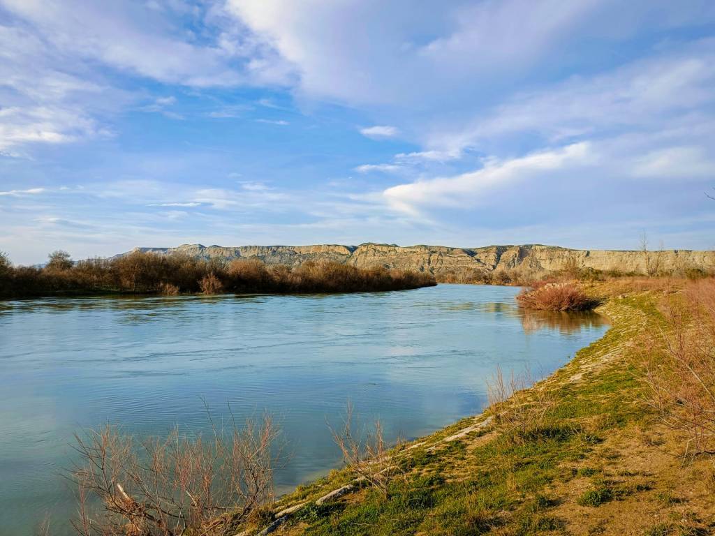 Por este sendero alcanzaremos el puente de la carretera de Monzalbarba. Si el río tiene un caudal bajo podemos ir a mano izquierda, pasar por debajo del puente y seguir por un sendero de pescadores que avanza paralelo al río. Nosotros tuvimos que cruzar la carretera y seguir por una pista ya que el caudal del río inundaba dicho sendero. Hay que tener en cuenta que hicimos la ruta en febrero y el caudal era el normal para estas fechas cuando no hay riadas, unos 425 metros cúbicos por segundo. Puedes consultar el cauce del río antes de comenzar la ruta en el siguiente enlace. Si el caudal es alto se desaconseja hacer esta ruta ya que podemos encontrar zonas inundadas.