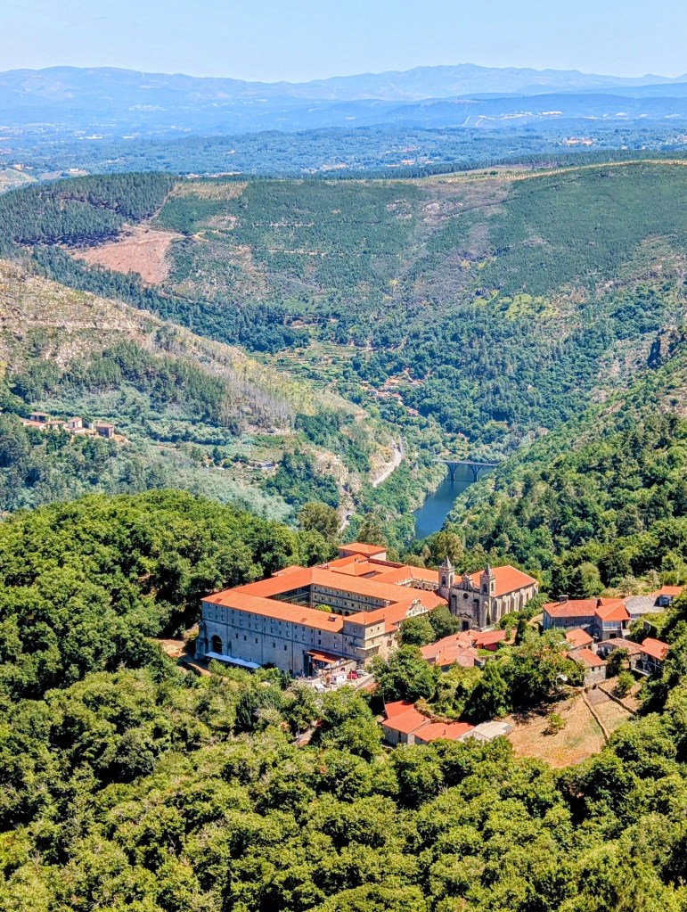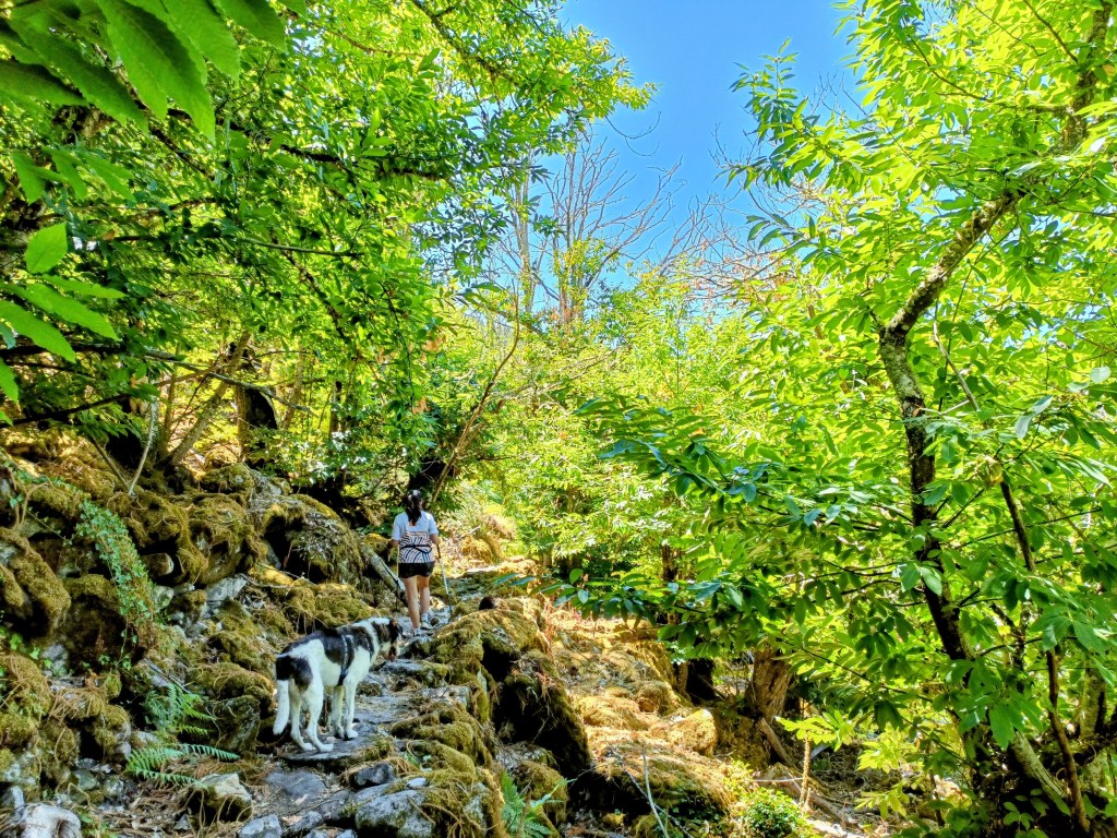 Tras una pausa en el claustro, donde aprovechamos para reponer fuerzas a la sombra, retomamos la marcha. Ahora toca subir hacia el pueblo de Castro, por un sendero empinado y bonito que atraviesa el bosque. A mitad de camino cruzamos la carretera que baja al monasterio y, desde una curva cercana, obtenemos otra buena panorámica del Sil.