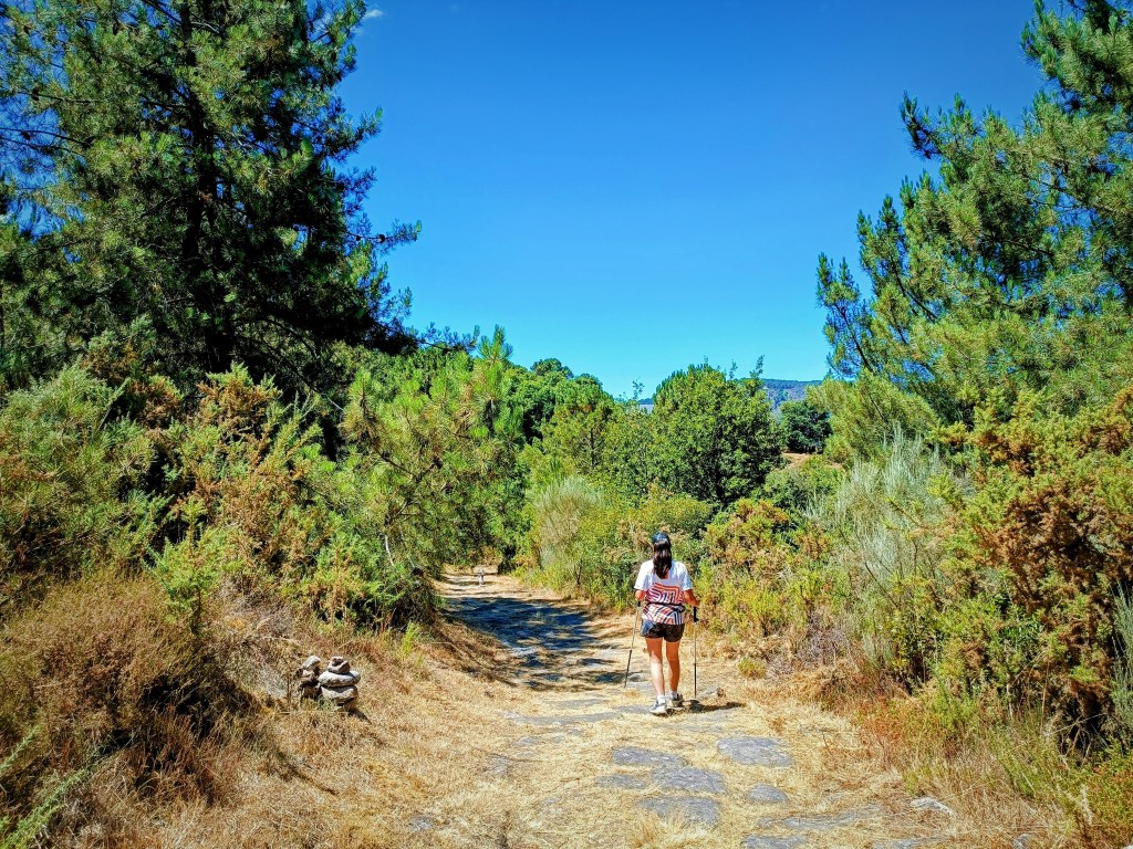 Tras hacer algunas fotos, seguimos adelante por una pista forestal que desciende y se adentra en el bosque. Después de varios cruces de caminos (conviene seguir el track), alcanzamos el pequeño pueblo de Portela.
