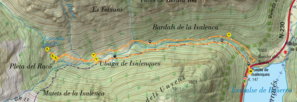 Cruzaremos la carretera por debajo y enseguida encontraremos una pasarela metálica que cruza el río Salenques. No la cruzaremos todavía, ya que la subida se realiza por el sendero que parte a la izquierda, señalizado con las marcas blancas y rojas del GR-11.