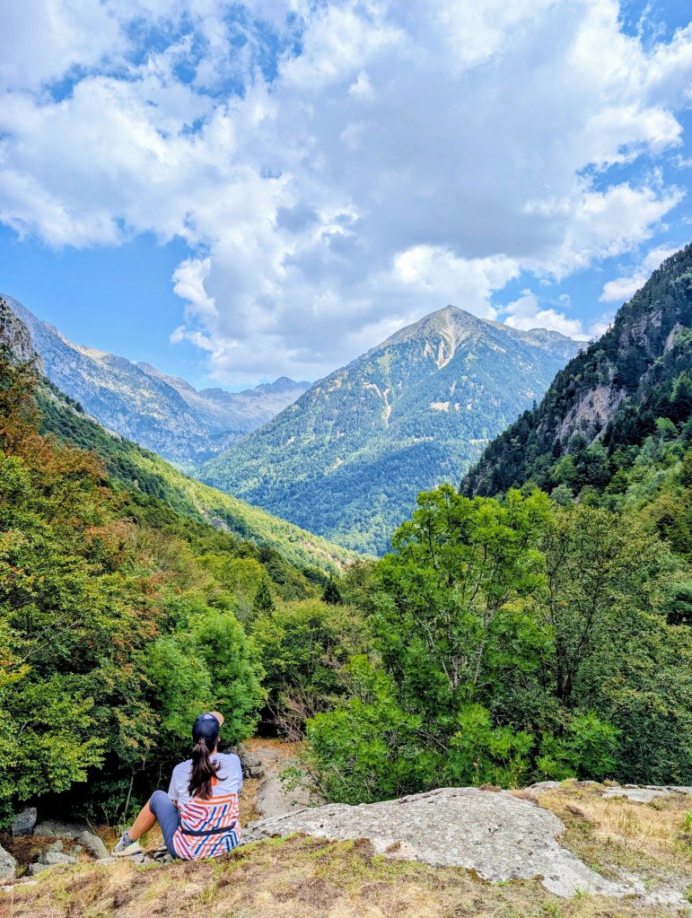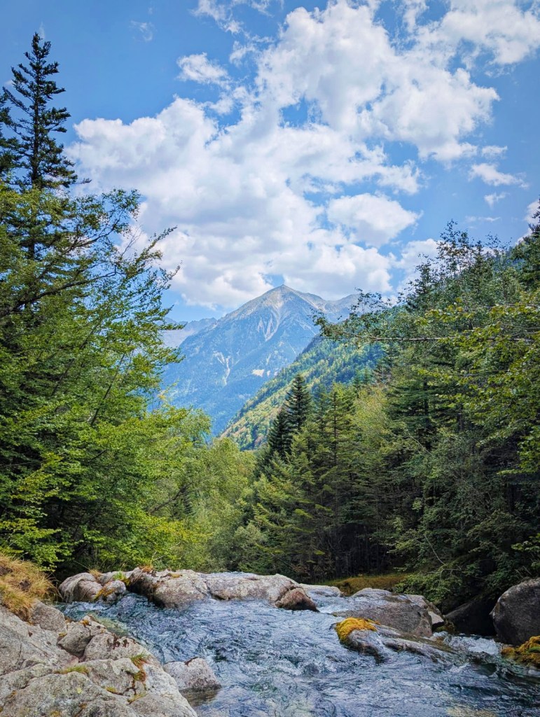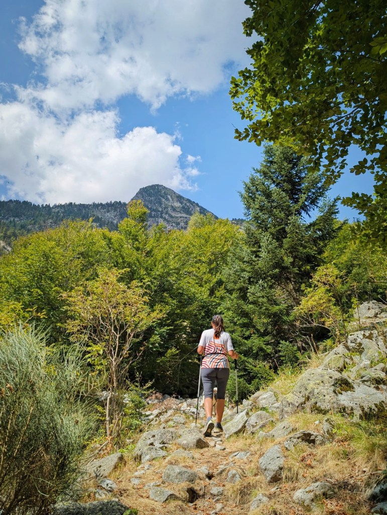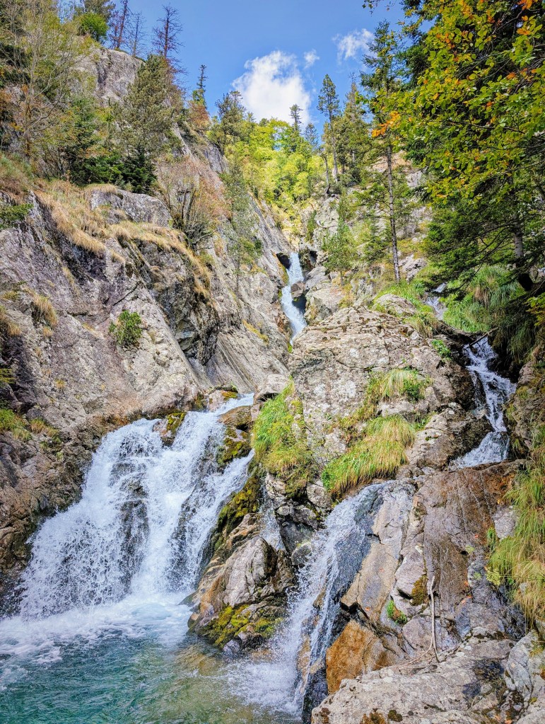 El camino asciende sin dificultad, permitiendo disfrutar del bosque, hasta llegar a un desvío señalizado. En ese punto abandonamos el GR-11, que sigue su camino al refugio de Llauset, y giramos a la derecha para cruzar el río por un puente de madera. Pocos metros más adelante aparece un nuevo cruce, donde tomamos el sendero de la izquierda, menos marcado, que conduce hacia la cascada del Pi.