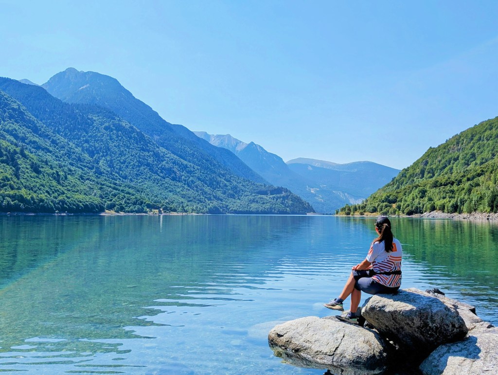 En un punto del descenso se abre una bonita panorámica hacia las montañas del otro lado del embalse, ya en Cataluña. Destaca el Tossal d’Escobedio, una montaña de silueta piramidal muy llamativa.